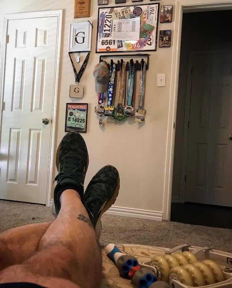 Nothing happening but foam rolling & hydration today. Getting the body ready for tomorrows long run. I like to sit in that chair & look at my running wall. It reminds me that it all started with a guy in his mid 30s that wanted to lose a few pounds. I would go the the high school track every morning. I would run as far as I could. The first day I could only make it half a lap. Run 1/2 & walk 1/2. No watch, no tracking. I just ran till I was tired, rested a bit & went again.